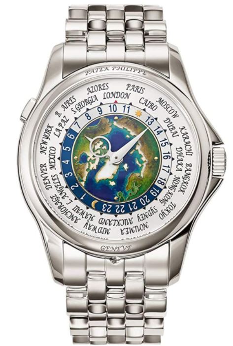 5131/1P – Complications Self-winding The new version of the famous Patek Philippe World Time watch evokes dreams of traveling in style. The center of its dial depicts the world in cloisonné enamel – for the first time from the perspective of the North Pole. It is an unusual view with depth and realism created by the artist with numerous coatings of different enamel paint colors. The platinum case and bracelet pay homage to the Far North, cloaking it with a silvery sheen. World Time. 24-hour and day/night indication for the 24 time zones. Cloisonné enamel center, North Pole. 18K gold dial plate. Platinum bracelet with fold-over clasp. Case: platinum. Sapphire-crystal case back. Water resistant to 30 m. Case diameter: 39.5 mm. Height: 10.61 mm.